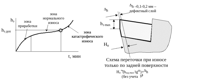 На практике известна величина износа по задней поверхности перед началом катастрофического участка для различных вариантов обработки (справочники). Она может составлять от 0,2 до 2,0 мм. Поэтому, допустимая величина износа по задней поверхности нормируется (задается). Как только износ по задней поверхности превысил допустимый, считается, что инструмент достиг предела нормального износа и он снимается с операции. Для неперетачиваемого инструмента этот критерий не используется.