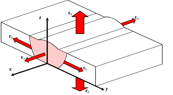 Как правило, жесткость свариваемых деталей неодинакова по различным направлениям. Например, в тонкой пластине сопротивление расширению активной зоны в плоскости пластины существенно сильнее, чем в направлении толщины. В этом случае компоненты напряжений и наблюдаемых деформаций также различны. В направлении толщины напряжения малы, а наблюдаемые деформации существенно выше, чем в плоскости пластины. При сварке тонких стержней наибольшие напряжения и наименьшие наблюдаемые деформации возникают в направлении вдоль оси стержня.