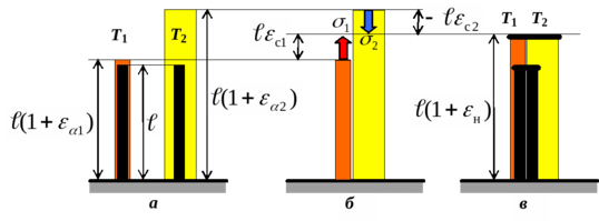 Рис. 7.1. Деформации при неравномерном нагреве: а - свободная температурная деформация зон, нагретых до разных температур (Т2 > Т1); б – собственные напряжения и деформации от взаимодействия скрепленных зон; в – совместная наблюдаемая деформация скрепленных зон
