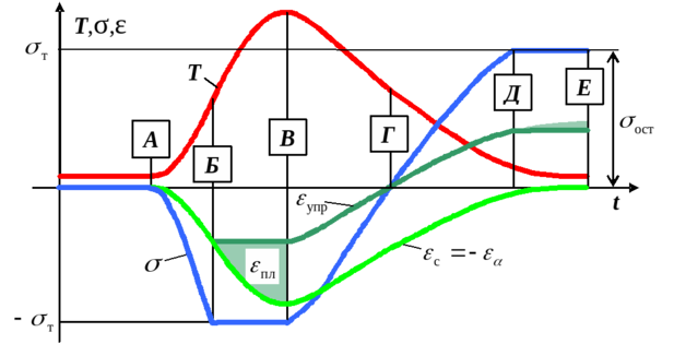 Если напряжение при нагреве не достигает предела текучести материала σт, то вся собственная деформация является упругой εупр (кривая εупр совпадает с кривой εс, а напряжение σ изменяется пропорционально εс), а при остывании происходит полная разгрузка и остаточные напряжения не образуются. Если же напряжение достигает σт (в момент времени Б), то рост напряжения и упругой деформации прекращается, дальнейшее увеличение εс при продолжении нагрева происходит за счет роста пластической деформации укорочения εпл.