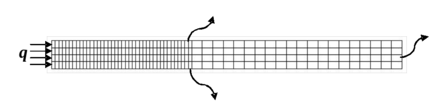 При моделировании тепловых процессов теплопроводность λ = 0,4 Вт/(см·К), объемная теплоемкость cρ = 5 Дж/(см3·К) и коэффициент теплоотдачи с поверхности αт = 0,006 Дж/(см2·с·К) приняты не зависящими от температуры. Граничные условия вводятся на контуре модели (рис. 7.18); поперечные сечения (x = const) являются адиабатическими границами. Распределенный по осевому сечению (y = 0) источник теплоты с удельной мощностью q = 50 Вт/мм2 действует в течение 1 секунды, после чего происходит выравнивание температур и остывание пластины. Окружающая среда – воздух с температурой 20 °С, такую же начальную температуру Tнач имеет пластина.