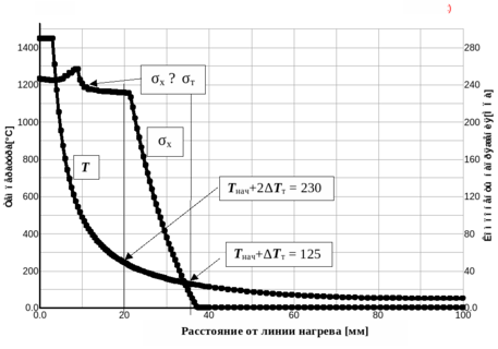 Рис. 7.20. Распределение максимальных температур T и продольных остаточных напряжений σx в поперечном сечении пластины
