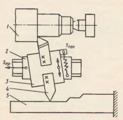 через щуп 4 (толкатель) управляет перемещением поперечного суппорта 3