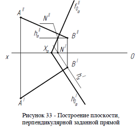 чтобы построить горизонтальную проекцию прямой строим перпендикуляр к горизонтальной проекции горизонтали.