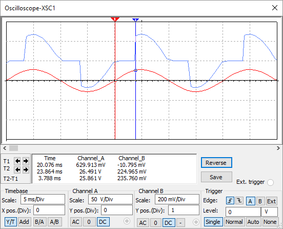 3.Снимите осциллограммы напряжения на нагрузке при C1 отключено и C1 включено (выключатель J1). Постройте графики.