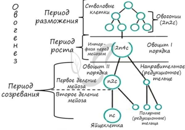 3)Созревания- Овоцит 1-го порядка (2n4c) –> Овоцит 2-го порядка (n2c) + редукционные тельца 3 шт. –> зрелая яйцеклетка (nc).