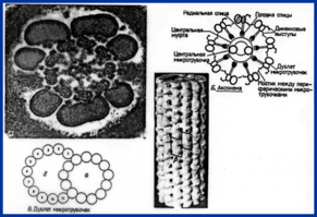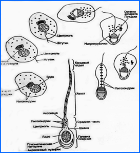Нити из белка тубулина (10 пар) образуют дуплеты, которые формируют цитоплазматическую оболочку, которая далее формируется в хвостик сперматозоида.