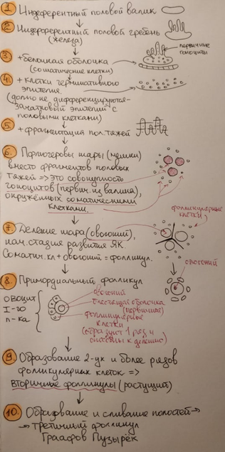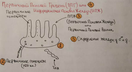Половые клетки закладываются в устье желточного мешка и развиваются из первичных гоноцитов (стволовые клетки).