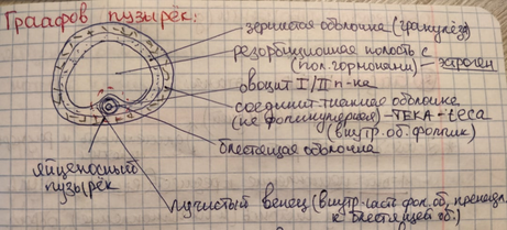 Граафов пузырек (третичный фолликул)- в нем происходит созревание яйцеклеток. Развивается под воздействием фолликулостимулирующего гормона. Достигнув зрелости, пузырек лопается, ооцит выступает из него на поверхность яичника, откуда идет в трубу яйцевода (воронку) – овуляция.