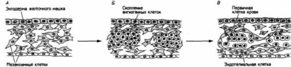 -В мезенхиме возникают кровяные островки, образованные плотными скоплениями отросчатых мезенхимных клеток. Центральные клетки отростков округляются и превращаются в первичные зародышевые клетки крови