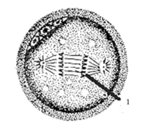 Взаимодействие пронуклеуса в яйцеклетке- в образовавшейся зиготе ядро СП набухает превращается в М пронуклеус (лишенный ядра) и сближается с Ж пронуклеусом, образуя синкарион (то есть ядра сближаются, но не сливаются друг с другом) сперматозоид совершает колебательные движения «Танец пронуклеуса» фактор преобразования пронуклеуса, М и Ж равных размеров (так как ядро СП вырастает в рез-те деконденсации хромосом и набухания) в первом митоическом делении участвуют два не слившихся пронуклеуса их оболочки разрушаются хромосомы конденсируются и в метафазе образуют метафазную звезду (на фото) ДРОБЛЕНИЕ.