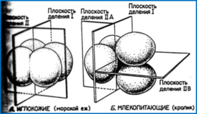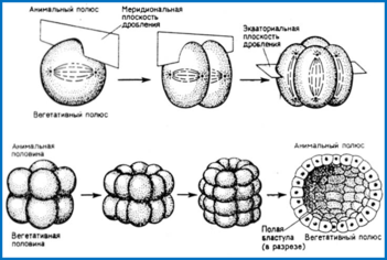-При полном дроблении плоскость первого деления соответствует плоскости двусторонней симметрии. Плоскость второго деления проходит перпендикулярно плоскости первого. Обе борозды первых двух делений меридианные, т.е. начинаются на анимальном полюсе и распространяются к вегетативному полюсу.