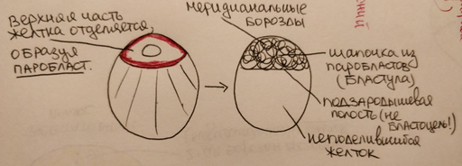 Тип меробластического дробления: (неполное, неравномерное) ограничено относительно небольшим участком у анимального полюса, плоскости дробления не проходят через всё яйцо и не захватывают желток.