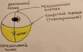 -Яйцевая клетка оказывается разделенной на четыре более или менее равных по размеру бластомера. Плоскость третьего деления проходит перпендикулярно первым двум в широтном направлении – широтная борозда.