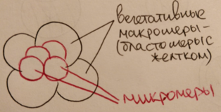 При дроблении соблюдается правило Гертвига-Сакса: ядро стремится расположиться в центре свободной от желтка цитоплазмы. Ось веретена дробления обычно совпадает с направлением наибольшей протяженности свободной от желтка цитоплазмы. (широтная борозда дробления) => 8 бластомеров (микро- и макромеры.