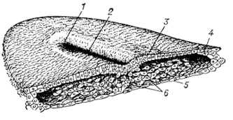 1 — гензеновский узелок; 2 — первичная полоска; 3 — эпибласт; 4 — край прозрачной зоны; 5 — гипобласт; 6 — клетки презумптивных энтодермы и мезодермы, мигрирующие из эпибласта через первичную полоску.