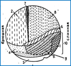 1 – хорда, 2 - эктодерма, 3 – энтодерма, 4 – боковая мезодерма, 5 – мезодерма сомитов, 6 – головная мезодерма, 7 – нервные гребни, 8 - нервная трубка, 9 – прехордальная пластинка