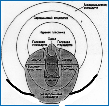 -Первичная полоска делится на 3 части: 1-ая (передняя 1/3 части) дает мезодерму сомитов, 2-ая (2/3 средняя части) листки спланхнотома (боковая и хвостовая мезодерма) , 3-я- (3/3 часть) -внезародышевую мезодерму-внезародышевые органы.