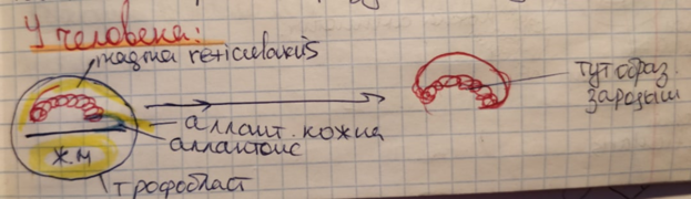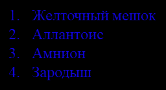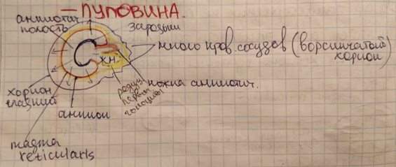 -С увеличением размера зародыша растет и амнион, при этом вытесняя желточный мешок и аллантоис (он оказывается между амниотическими полостями, его стенками). Между стенками амниона образуется канатик (ПУПОВИНА), в котором оказывается аллантоис и желточный мешок.