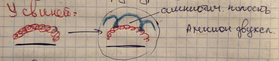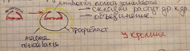 Образование полостей и трещин, но они не сливаются, а края эпибласта растут в виде мешочка наверх амнион. Зародыш образуется из нижней части эпибласта.