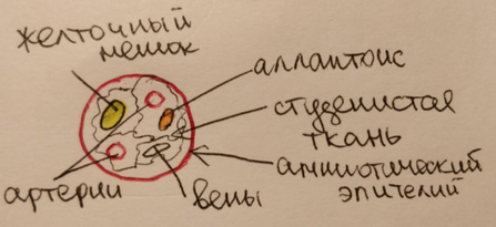 На срезе аллантоис кубической формы (цилиндрической), а у желточного мешка уплощен.