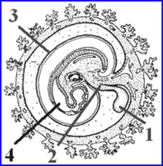 Зародыш окружает амнион, который образует пупочный канатик. Снаружи амнион образует гладкий и ворсинчатый хорион. Во время имплантации образуется плацента.