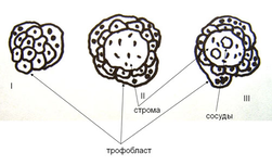 III – третичные ворсины (синтрофобласт + мезенхима + кровеносные сосуды)