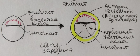 Деламинация:Из гипобласта пролиферирующие клетки опускаются вниз и прорастают в magma reticulris и образуется стенка из гипобласта образование желточного мешка.- внезародышевый орган (первичный зародышевый мешок-не внезародышевый орган). Ф: первый орган кроветворения + образование устья у желточного мешка, в котором из клеток гипобласта образуются первичные гоноциты.