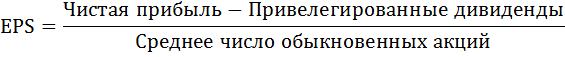 Прибыль (доход) на акцию (EPS) – одна из ключевых характеристик эффективности работы фирмы с позиции её акционеров, рассчитываемая соотнесением чистой прибыли, доступной к распределению среди держателей обыкновенных акций, к средневзвешенному числу этих акций. Формула расчёта:
