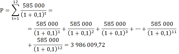 Найдём современную стоимость регулярного финансового потока (срочных аннуитетов PVA), то есть сумму всех платежей типичной схемы, дисконтированных на начало периода первого платежа.
