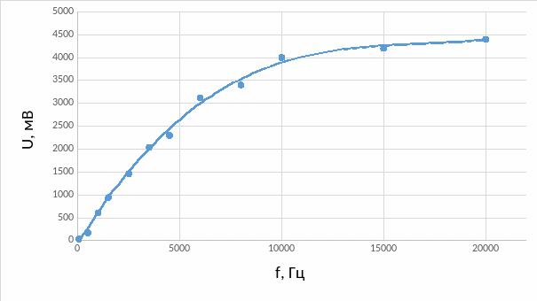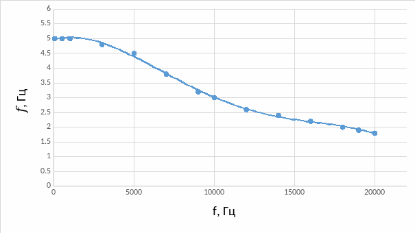 Проделаем тоже самое, что и в первом опыте.| f, Гц | A, В | f, Гц | A, В |