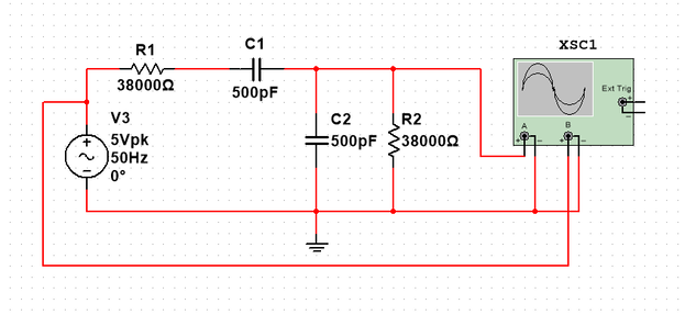 Рис. 11. Схема моста Вина с подключенным осциллографом для снятия характеристик