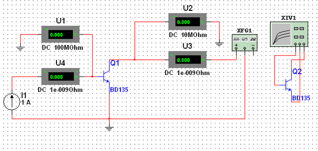 * U4 – амперметр постоянного тока; используется для измерения тока базы биполярного транзистора Q1;