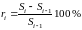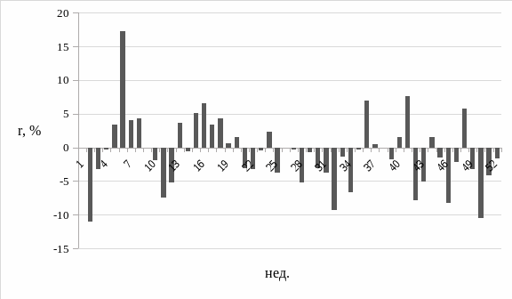 На рис. 12 представлены результаты расчёта доходности как разности средней цены текущей недели и средней цены предыдущей недели, делённой на значение средней цены предыдущей недели, выраженной в процентах (2).
