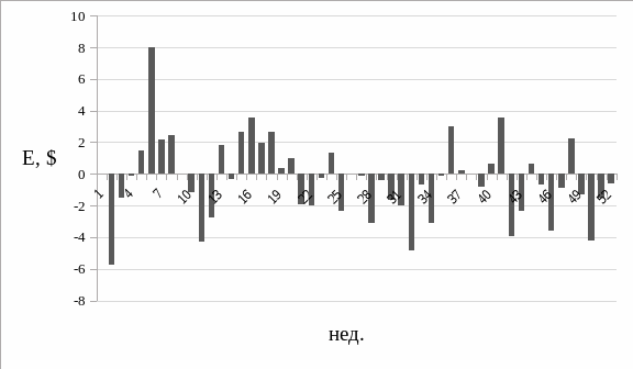 На рис. 11 представлены результаты расчёта изменений цен на нефть. Изменение цены на нефть за i-ю неделю