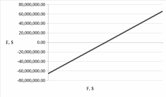 Рассчитанные статистические параметры нефтяного рынка позволяют построить график ценового риска компании «С » (рис. 13). На этом графике отражается зависимость прибыли компании от реализации нефти (E) от изменения цены на нефть марки Urals (S). На горизонтальной оси графика отображаются возможные цены на нефть марки Urals в долларах США за тонну на момент совершения сделки (через один месяц). При этом в качестве точки безубыточности (форвардной месячной цены