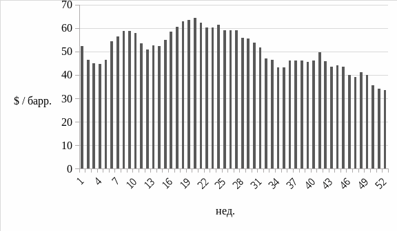 Рис. 10. Средние значения недельных цен на нефть на нефть марки Urals за 2015 год