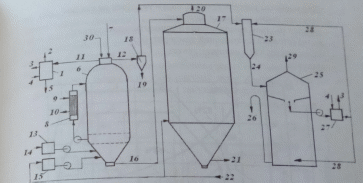 1 - терпентинный конденсатор; 2 – несконденсировавшиеся газы; 3 – горячая вода; 4 – чистая холодная вода; 5 – конденсат; 6 – варочный котел; 7 - щепа; 8 – теплообменник; 9 – греющий водяной пар; 10 – конденсат водяного пара; 11 – терпентинная сдувка; 12 – конечная сдувка; 13 – бак-мерник; 14 – белый щелок из цеха каустизации; 15 – бак-мерник черного щелока; 16 – выгружаемая из котла волокнистая масса; 17 – выдувной резервуар; 18 – циклон-ловушка; 19 – волокна и щелок в бак черного щелока; 20 – пары самовскипания щелока; 21 – волокнистая масса в промывной отдел; 22 – черный щелок из промывного отдела; 23 – струйный конденсатор; 24 – горячий конденсатор; 25 – бак-аккумулятор; 26 – грязный конденсат в сток; 27 – спиральный теплообменник; 28 – охлажденный конденсат; 29 – вентиляция; 30 – пар для уплотнения щепы.