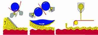 Существенное повышение белизны бумаги достигается ее мелованием – нанесением на поверхность бумаги покровного слоя, содержащего пигмент высокой степени белизны. В мелованной бумаге содержится большое количество наполнителей: каолин, карбонат кальция, диоксид титана. Мелование подразделяется на легкое, полное и литое. При различных видах обработки не только варьируется количество наносимой меловальной пасты, но и изменяется характер ее проникновения в структуру бумажного полотна. Глубина проникновения может быть как значительной, так и небольшой. Мелование может быть трех видов: шаберное, пленочное и шторное (рис. 8).