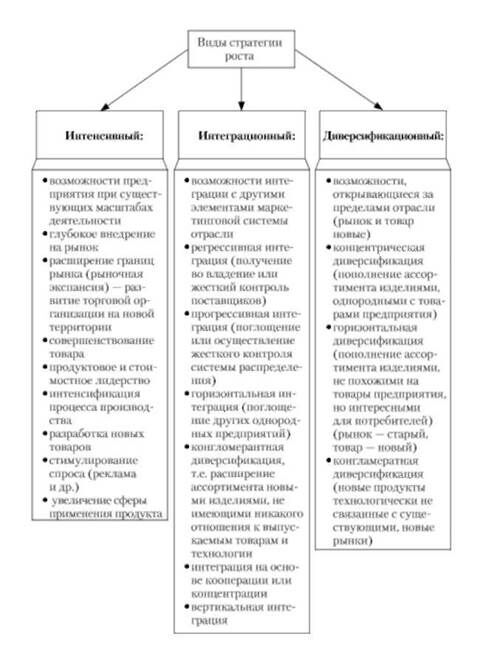 Первый столбец показывает направленность стратегии предприятия на существующие продукты и рынки. Эту стратегию называют методом экономии издержек, или "улучшай то, что уже делаешь". Эта стратегия выбирается теми хозяйственными подразделениями (ХП) предприятия, рынок продукции которых продолжает развиваться или еще не насыщен. Предприятие стремится расширить сбыт выпускаемых товаров на традиционных рынках путем таких маркетинговых усилий, как установление конкурентоспособных цен, наступательная реклама, интенсификация продвижения товаров и т.п. При этом возможны следующие альтернативы интенсивного роста: