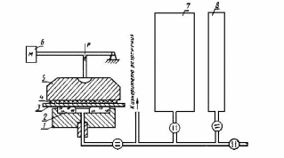 1 - опорный столик; 2 - стеклянная пластина; 3 - испытуемый образец; 4 - резиновая прокладка; 5 - прижимной диск; 6 - рычаг с грузом; 7 - вакуумная камера вместимостью 380см ; 8 - вакуумная камера вместимостью 38 см