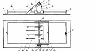 1 — стекло, 2 — рамка, 3 — рейсфедеры. 4 — ползунки, 5 — валик, б — рычажок, 7 — шайба, 8 — рамка с пружинами, 9— ручка, 10— арретир, 11 — шестеренка 2,0 мм, которые сразу осушают промокательной бумагой и ширину штрихов измеряют с погрешностью ±0,1 мм.