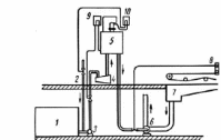 1 – машинный бассейн, 2 – водяной трубопровод, 3 – массный насос, 4 – коническая мельница, 5 – массный переливной бачок, 6 – смесительный насос, 7 – сборник оборотной воды, 8 – регулятор веса, 9 – регулятор уровня массы, 10 – самописец регулятора массы