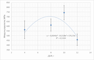 Модуль упругости - сопротивление растяжению/ сжатию при упругой деформации – сначала увеличивается при увеличении массы ДБФ, затем уменьшается. График имеет криволинейную зависимость.