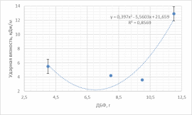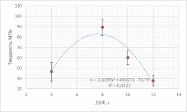 Способность композита сопротивляться вдавливанию изменяется в зависимости от массы ДБФ. График имеет параболическую форму. Наибольшее значение твердости соответствует значению массы ДБФ, равному 8 г.
