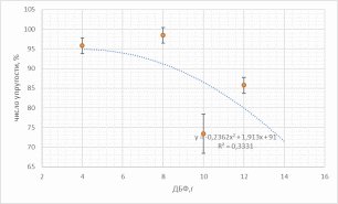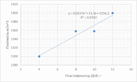 На графике представлена линейная зависимость, показывающая увеличение плотности с ростом количества ДБФ, т.к. дибутилфталат является пластификатором – веществом, которое вводят в полимерный материал для увеличения эластичных и пластичных свойств.