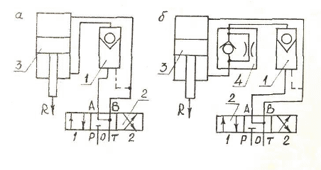 Поступающая в поршневую полость гидроцилиндра 3 жидкость создает в гидроцилиндре управления гидрозамка 1 давление, достаточное для открытия гидрозамка. В результате этого жидкость из штоковой полости гидроцилиндра 3 пойдет на слив, вытесняясь движущимся вниз поршнем под действием внешней нагрузки R. Скорость спускания поршня, возрастал, может достигнута такой величины, что поршневая полость гидроцилиндра 3 не будет успевать заполняться жидкостью, поступающей от насоса. Это вызовет снижение давления в этой полости и в гидролинии управления гидрозамком, в результате чего запорный элемент гидрозамка сработает, слив жидкости прекратится, поршень 8 и нагрузка также прекратят движение. По мере заполнения жидкостью поршневой полости давление в линии управления вновь возрастает, гидрозамок вновь откроется, обеспечивая слив жидкости из штоковой полости гидроцилиндра. Такая схема включения гидрозамка создает пульсацию давления жидкости в линии управлений и прерывистое движение нагрузки. С целью обеспечения плавности опускания нагрузки и стабилизации давления жидкости в линии управления между неразгруженным гидрозамком и гидроцилиндром часто устанавливают дроссель с обратным клапаном (см. рис. 1.21, б). Дроссель обеспечивает заданный расход жидкости, стабилизирующий давление управления и скорость опускания нагрузки.