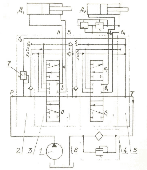 На рис. 1.16 представлена гидравлическая схема, обеспечивающая последовательное подключение гидродвигателей. При последовательной схеме соединения каналов гидрораспределителей жидкость от насоса 1 через напорный канал Н поступает к отверстиям А или В и к гидродвигатель Д1. Сливная линия гидродвигателя Д1 обеспечивает поступление жидкости через промежуточную секцию 6 в напорную гидролинию Н второго гидродвигателя Д2. При такой схеме соединения гидродвигателей рабочее давление в каждом последующем гидродвигателе равно давлению на входе из предыдущего гидродвигателя. Давление жидкости, подводимой отверстию Р, будет определяться суммой сопротивлений всех включенных последовательно гидродвигателей. При этом во всех отводах рабочих секций, расположенных за промежуточной секцией, должны быть установлены предохранительные клапаны. Расход рабочей жидкости каждым гидродвигателем при такой схеме соединения будет неизменным, тем самым обеспечивается работа с одинаковой скоростью нескольких потребителей.