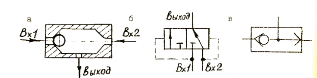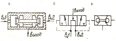 Наличие давления, например, во входной линии Bxl обеспечивает закрытие входного канала Вх2 и открывает выход жидкости к потребителю из канала Bxl. Таким образом, операция "ИЛИ" обеспечивает на выходе сигнал, если на входе появляется один из двух сигналов управления.