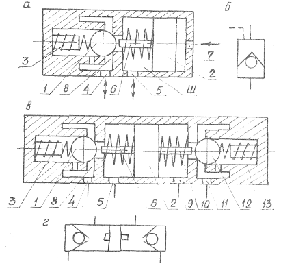а-односторонний гидрозамок; б-обозначение на гидросхемах; в-двусторонний гидрозамок;